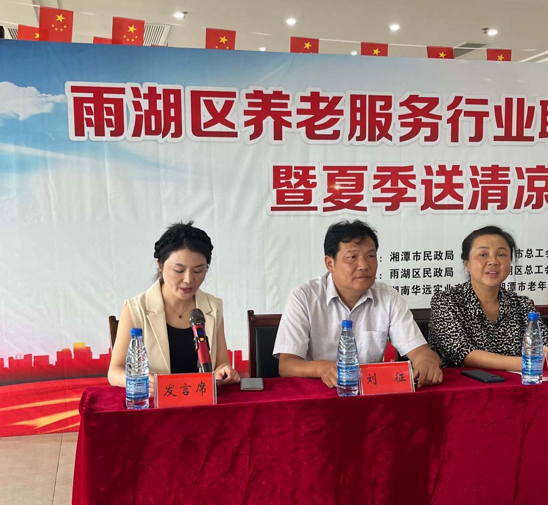 8月23日,雨湖區(qū)養(yǎng)老服務(wù)行業(yè)聯(lián)合工會(huì)授牌儀式暨夏季送清涼活動(dòng)在我院舉行。區(qū)總工會(huì)黨組書(shū)記、常務(wù)副主席劉征,人大常委會(huì)副主任、區(qū)總工會(huì)主席譚聯(lián),市總工會(huì)黨組成員、副主席羅軍,湘潭市民政局黨委委員、副局長(zhǎng)韓賢海,雨湖區(qū)委副書(shū)記蔣文武,市工會(huì)組織部部長(zhǎng)劉志勇,以及來(lái)自雨湖區(qū)各養(yǎng)老機(jī)構(gòu)的負(fù)責(zé)人代表參會(huì),雨湖區(qū)民政局黨組書(shū)記、局長(zhǎng)干建暉主持會(huì)議,華遠(yuǎn)康養(yǎng)中心法人譚燦任首屆工會(huì)主席。